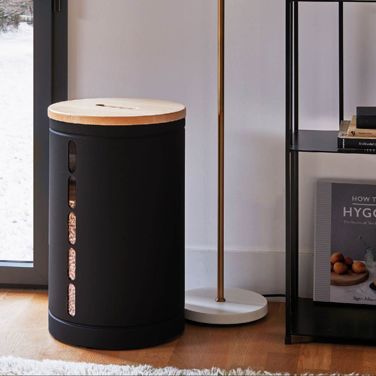 Une forme simple et élégante pour ce rangement à granulés Octaris. Coffre à pellet design et élégant, il intègre une fenêtre pour visualiser le niveau de granulés. Son couvercle en bois apporte une touche chaleureuse près du coin feu
