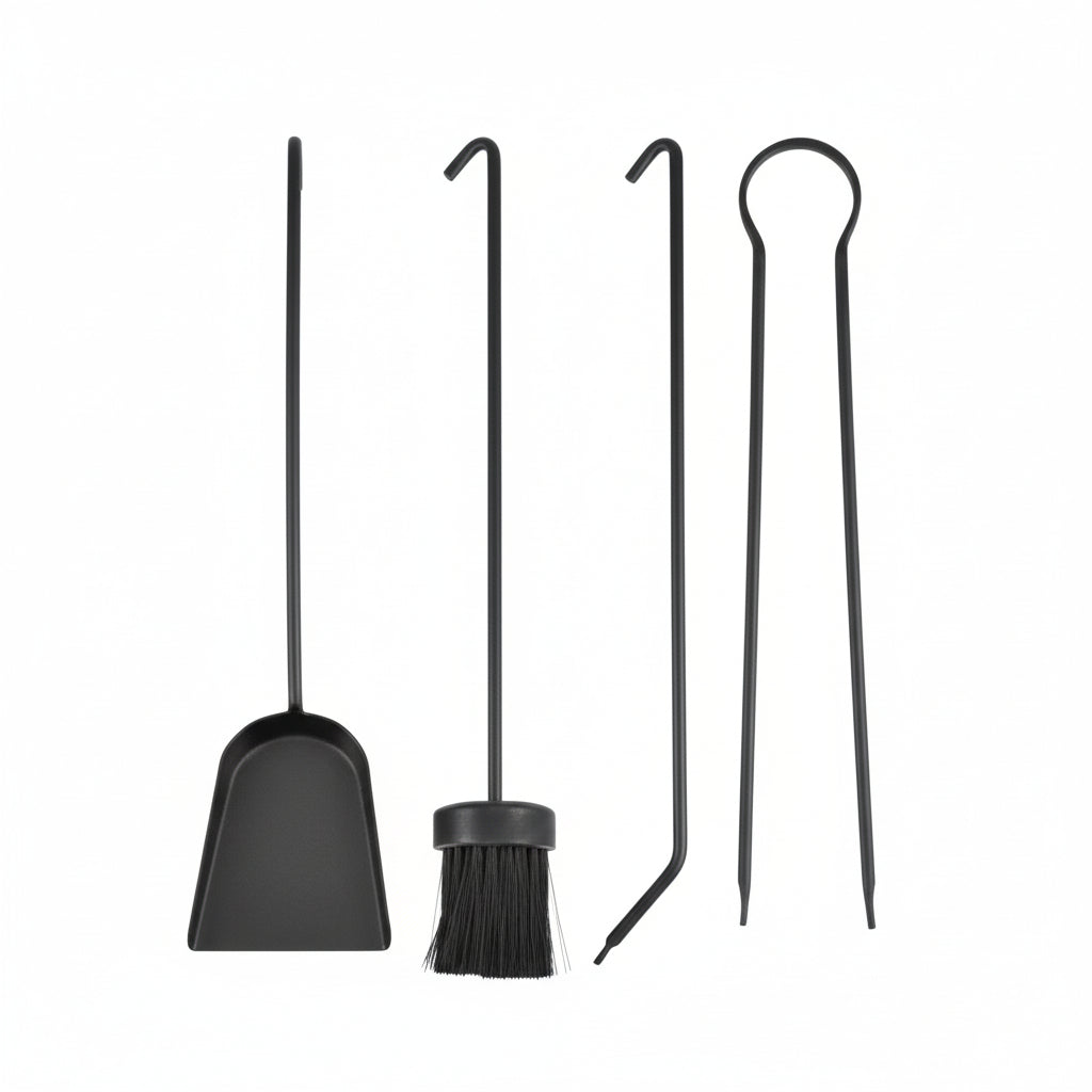 Vous y trouverez pelle, balayette, pince et tisonnier pour entretenir la flamme et le foyer.